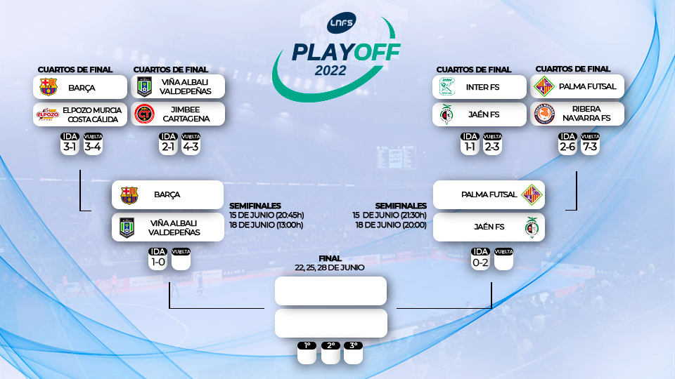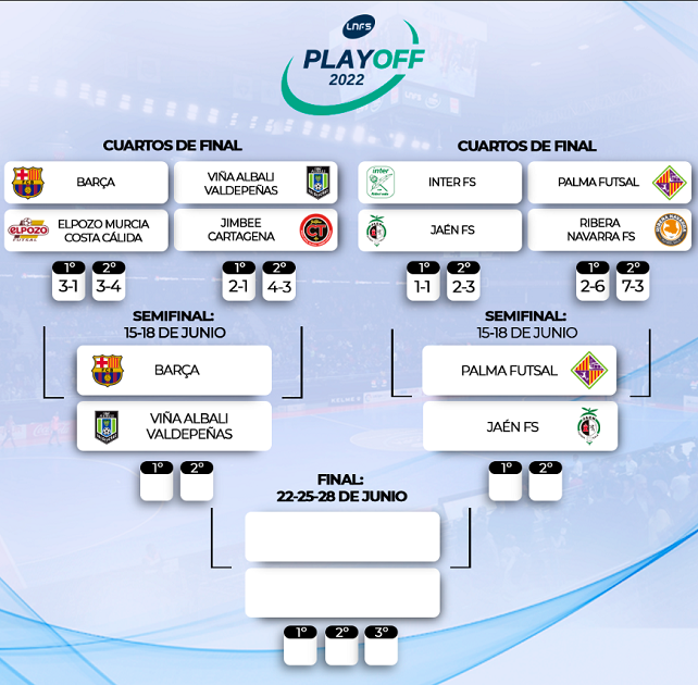As partidas de ida das semifinais acontecem no dia 15 de junho. Viña Albali Valdepeñas, Barça, Jaén FS e Palma Futsal estarão encarregues de luta