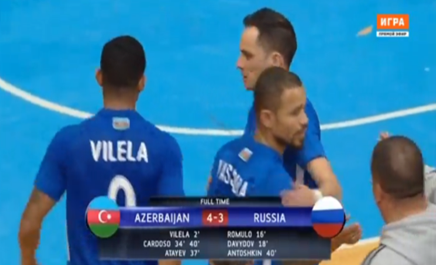 O Azerbaijão bateu à momentos a Rússia por 4-3, depois de ontem ter sido derrotado pela Croácia.Com golos de Vilela (1) Everton Cardoso (33,39) e
